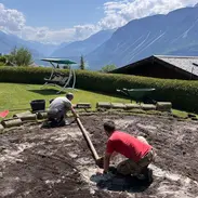 Après démontage de la structure d'une piscine, préparation du terrain pour la pose de rouleaux de gazon pré-cultivés.